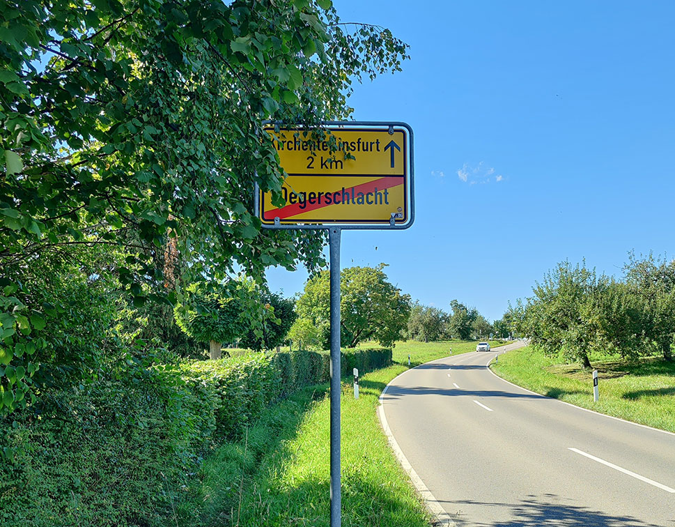 Die einen vermuten eine alte Schlacht mit Degen – „als die Schweden einfielen“, wie jemand mutmaßte. „Schweden? Gab’s die da schon?“, fragte ein anderer. „Dann waren’s wohl Wikinger!“, scherzte jemand aus der Gruppe. Schließlich war der Ort bereits 1092 in historischen Dokumenten erwähnt worden. Wahrscheinlicher, so Schweickert, stamme „Deger“ von einem alten Wort für ein großes Waldgebiet – das „geschlagen“, also gerodet wurde, um hier eine Siedlung zu errichten.