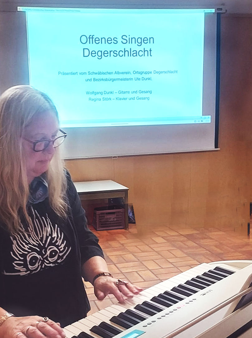 Wolfgang hat die Sänger mit der Gitarre begleitet, ich am Klavier, Ute Dunkl, unsere Bezirksbürgermeisterin, hat die Texte per Beamer an die Leinwand geworfen und sogar Getränke aus der Gemeindekasse spendiert.
