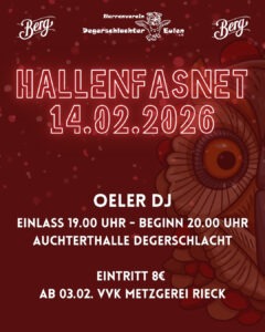 Der Narrenverein Degerschlachter Eulen feiert am 14. Februar Hallenfasnet mit Oeler DJ in der Auchterthalle Degerschlacht.