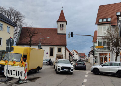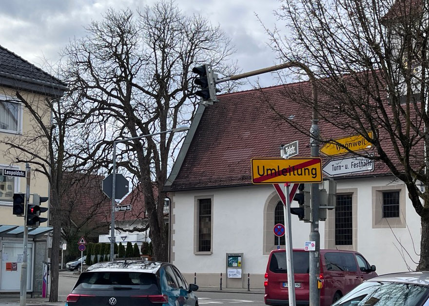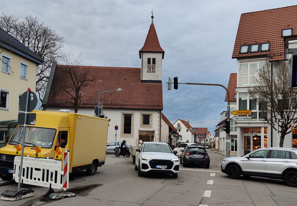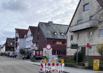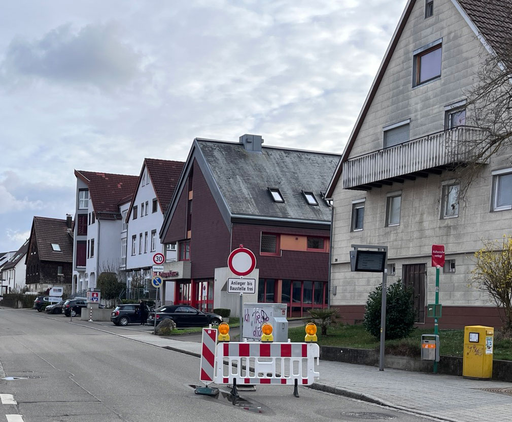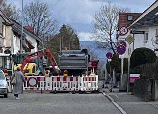 Wir sind heute aus unserem verlängerten Wochenende nach Hause gekommen. Wir wussten doch, dass in der Leopoldstraße gebaut wurde. Deshalb sind wir gleich über Wannweil und dann über die Martin-Knapp-Straße gekommen. Wir wohnen – wie jeder weiß, gleich hinter der Absperrung mit der Aufschrift „Anlieger frei.“ Bis zu unserem Haus kommen wir mühelos. Ein paar Meter weiter aber ist die Baustelle. An der kommt niemand vorbei.