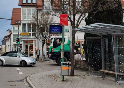 - Der Bus hält in beide Richtungen an der neuen Ortsmitte hinterm Bäcker.