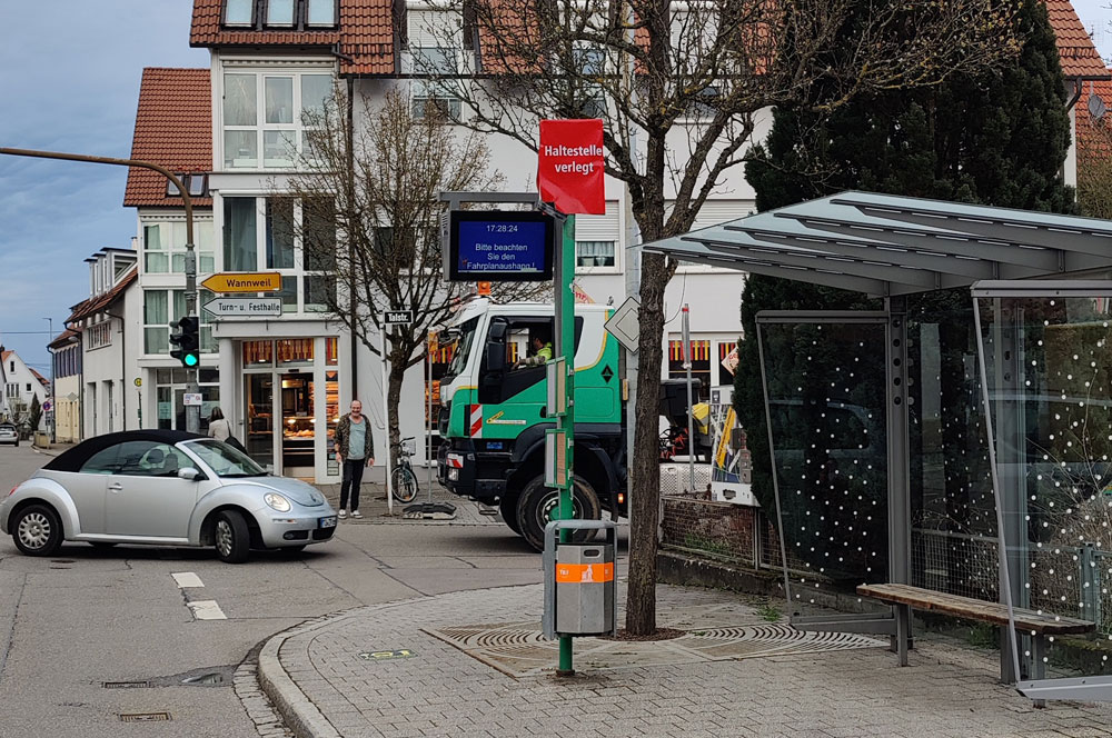 Heute Morgen, erzählte eine Nachbarin, seien die Leute an der Bushaltestelle gestanden wie immer. Die rote Mütze über dem Haltestellenschild mit dem Hinweis „Haltestelle verlegt“ hatten sie offensichtlich übersehen.
